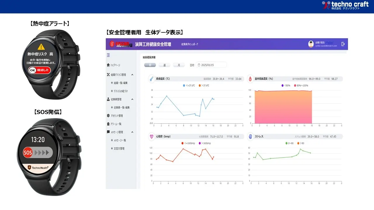 具体的には、テクノクラフトのウェアラブル端末で取得した作業員の生体データ(心拍数、体温、活動量など)を分析し演算工房の通信機および通信網を介して、利用者及び安全管理者へ送信します。これにより、熱中症リスク、健康状態の悪化、転倒転落の可能性などを検知し、アラート又はSOSを発することで、工事現場における安全管理・事故防止に寄与します。
